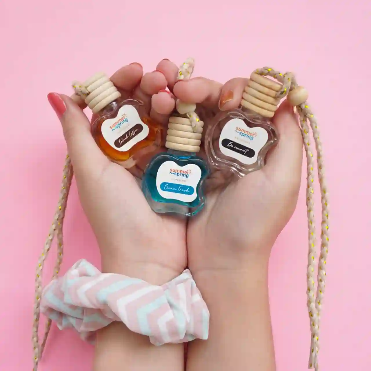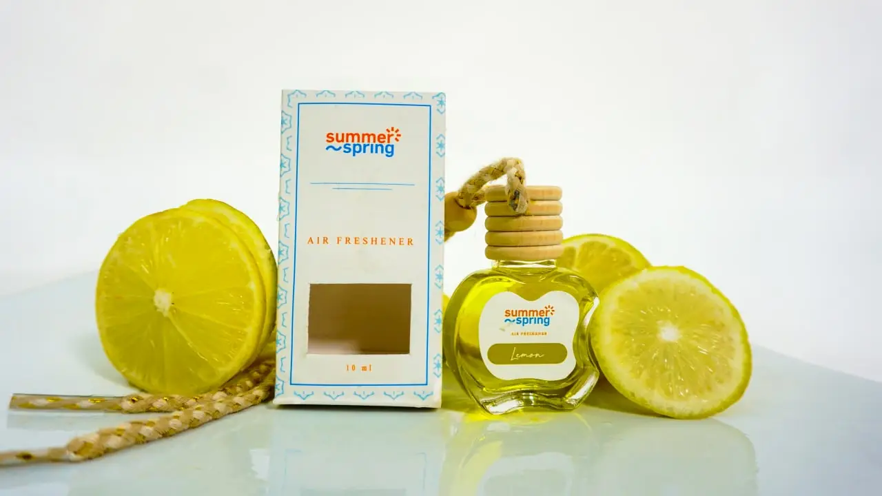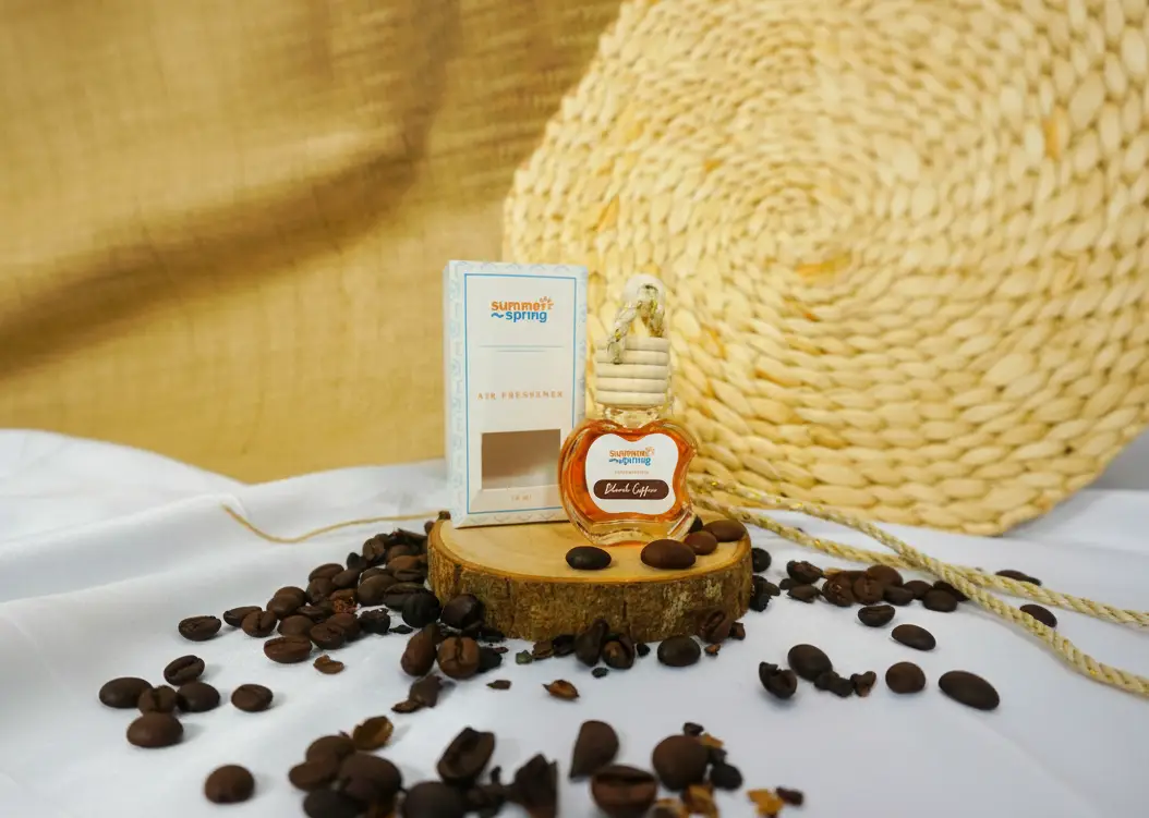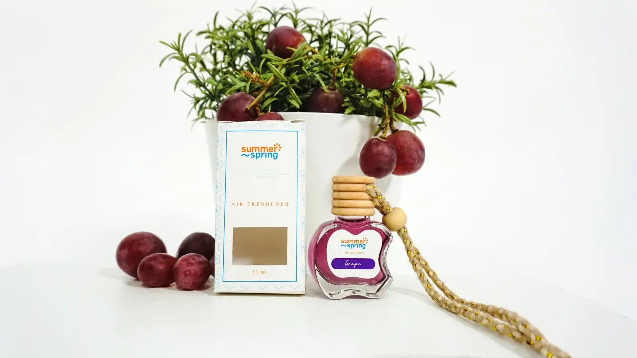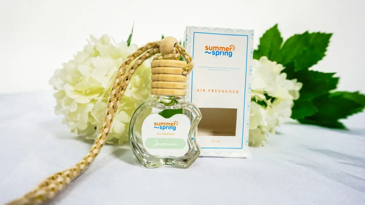 Parfum gantung berbentuk botol kecil dengan penutup kayu. Tersedia sekitar 15 varian aroma dengan harga terjangkau.
